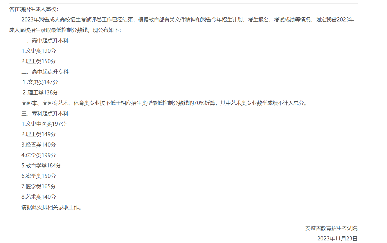 錄取分數線根據每年的考試難度、考生人數和招生計劃等因素而定??忌稍诳荚嚱Y束后通過安徽省教育考試院網站查詢本人成績及錄取分數線。同時,考生也需關注報考院校的具體錄取分數線要求??忌蓞⒖?024年安徽省成人高考錄取分數線: