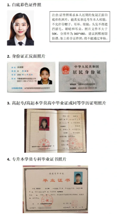 照片材料:考生需準備一張符合安徽省成人高校招生網上報名要求的照片,用于學生入學后制作畢業證、學籍照片等。