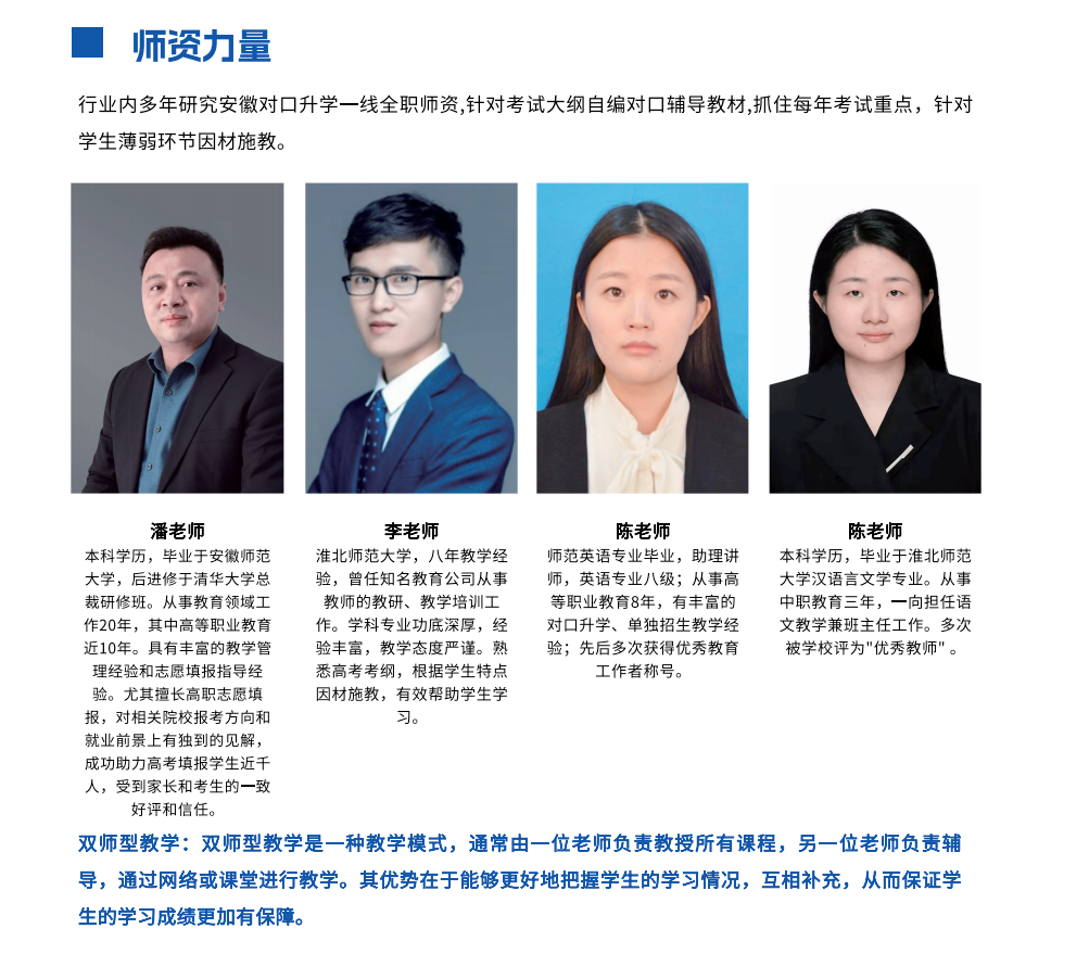 安徽單招網集訓營擁有一支高水平的師資隊伍。這些教師不僅具備深厚的學科背景和豐富的教學經驗,還熟悉單招考試的命題規律和考試動態。他們能夠根據學生的學習情況和需求,制定個性化的教學計劃,提供精準的教學指導。在教學過程中,教師們注重激發學生的學習興趣和積極性,鼓勵他們主動思考和探索,從而提高學生的學習效率和成績。