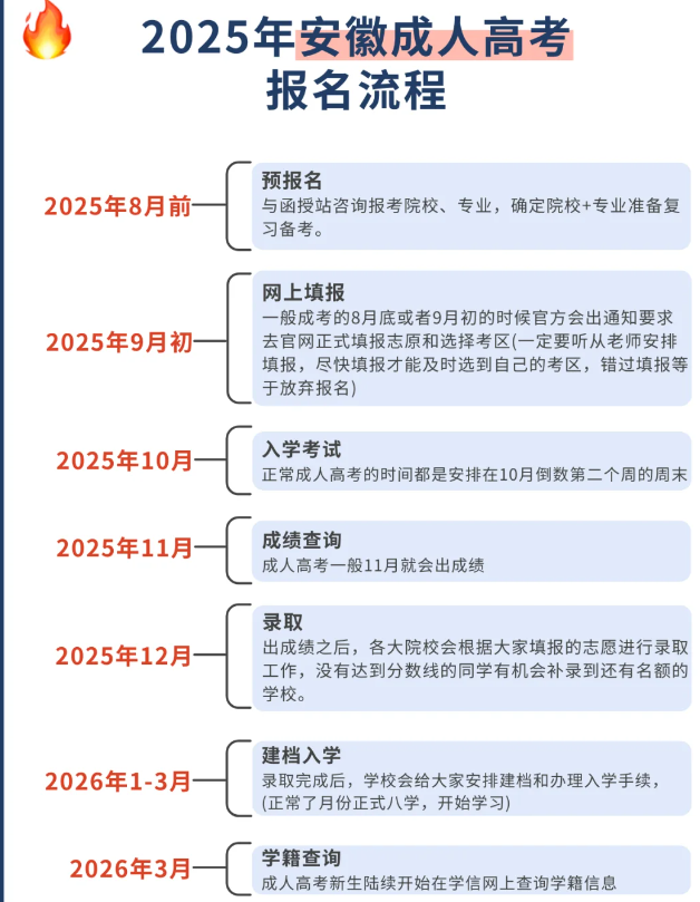 2025年8月之前 ?預報名 在函授站咨 詢報考專業和院校,認真備考,考試科目三科,總分數450分,滿25周歲政策加分20分。 2025年9月 ?網上報名 一般成人高考8月底9月初會開通報名入口,去官網正式填報志愿和選擇考區。 2025年10月底 ?入學考試 正常成人高考的時間都是在10月倒數第二個周的周末,所以今年在10月21-22日入學考試。 2025年11月~12月 ?錄取查詢 出成績之后,各大院校會根據大家填報的志愿進行錄取工作,沒有達到分數線的同學有機會補錄到還有名額的學校 2026年3月 ?建檔入學 錄取完成后,學校會給大家建檔和辦理入學手續。(正常3月份正式入學,開始學習。) 2026年4月-5月 ?學籍查詢