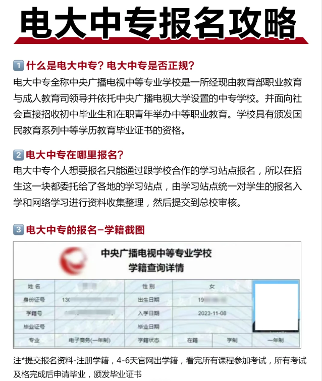 學籍查詢:報名一周后,登錄中央廣播電視中等專業學校學籍查詢頁面,輸入個人信息即可查詢。