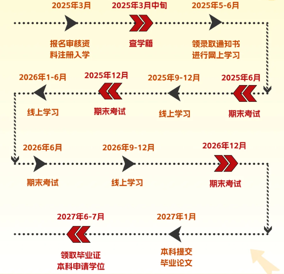 預計畢業時間:考生從2025年春季入學開始計算,經過兩年半的學習(即預計至2027年秋季左右),如符合畢業要求,即可領取畢業證書。但請注意,具體畢業時間可能因個人學習進度、學校安排等因素而有所差異。