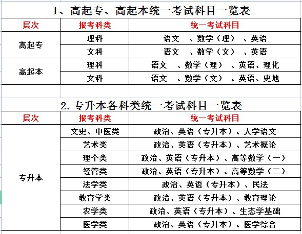 考試科目根據報考層次和專業而有所不同,一般包括語文、數學、外語、專業課等。