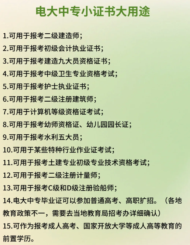 該證書可用于報考幼兒教師資格證、藥師從業資格證等職業資格證書,也可用于報名參軍入伍、成人高等學歷(如自考、成人高考、網絡教育、國家開放大學等)。